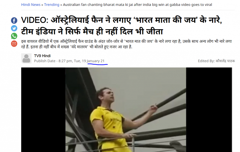 തുടർന്ന് ഞങ്ങൾക്ക് ജനുവരി 20ന് ടിവി9 ഹിന്ദി പ്രസിദ്ധീകരിച്ച ഒരു റിപ്പോർട്ട് കിട്ടി. ഭാരത് മാതാ കീ ജയ്’ എന്ന ഓസ്ട്രേലിയൻ ആരാധകൻ വിളിക്കുന്നു എന്നായിരുന്നു റിപ്പോർട്ടിന്റെ തലക്കെട്ട്. “മത്സരം മാത്രമല്ല, ഹൃദയവും ടീം ഇന്ത്യ വിജയിച്ചു. ബ്രിസ്ബേനിലെ ഗാബയിൽ നടന്ന ഫൈനൽ മത്സരം ഇന്ത്യ വിജയിച്ചു. ഇന്ത്യ- ഗവാസ്കർ ട്രോഫി 2-1 എന്ന സ്കോറിന് ഇന്ത്യ നേടി. ഇന്ത്യയും ഓസ്ട്രേലിയയും തമ്മിലാണ് ഈ മത്സരം നടന്നത്,” എന്നാണ് റിപ്പോർട്ട് പറയുന്നത്.