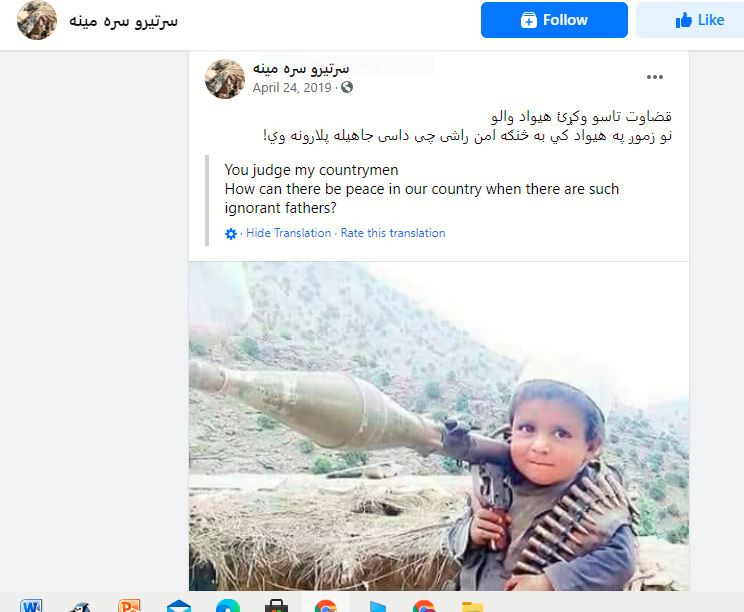 Talibanന്റെത് എന്ന പേരിൽ ഒരു കുട്ടി റോക്കറ്റ് ലോഞ്ചർ പിടിച്ചു നിൽക്കുന്ന ഒരു പടം ഫേസ്ബുക്കിൽ വൈറലാവുന്നുണ്ട്.