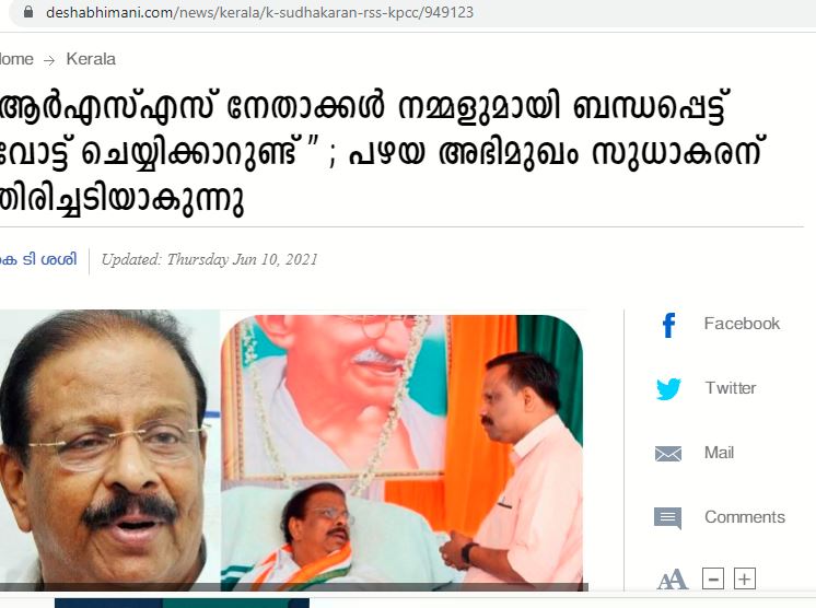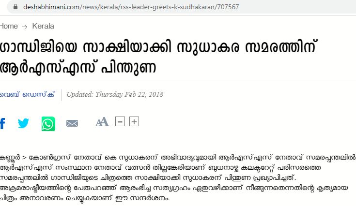 തുടർന്ന്, ”കെ സുധാകരൻ, വത്സൻ തില്ലങ്കേരി, ഗാന്ധിജി” എന്നീ കീ വേർഡുകൾ ഉപയോഗിച്ച് തിരഞ്ഞപ്പോൾ, ഫെബ്രുവരി 22 2018 ദേശാഭിമാനി പത്രം പ്രസിദ്ധീകരിച്ച ഒരു വാർത്ത കിട്ടി. ”കോണ്ഗ്രസ് നേതാവ് കെ സുധാകരന് അഭിവാദ്യവുമായി ആര്എസ്എസ് നേതാവ് സമരപ്പന്തലില്. ആര്എസ്എസ് സംസ്ഥാന നേതാവ് വത്സന് തില്ലങ്കേരിയാണ് ബുധനാഴ്ച കലക്ടറേറ്റ് പരിസരത്തെ സമരപ്പന്തലില് ഗാന്ധിജിയുടെ ചിത്രത്തെ സാക്ഷിയാക്കി സുധാകരന് പിന്തുണ പ്രഖ്യാപിച്ചത്. അക്രമരാഷ്ട്രീയത്തിന്റെ പേരു പറഞ്ഞ് ആരംഭിച്ച സത്യഗ്രഹം ഏതു വഴിക്കാണ് നീങ്ങുന്നതെന്നതിന്റെ കൃത്യമായ ചിത്രം അനാവരണം ചെയ്യുകയാണ് ഈ സന്ദര്ശനം,” എന്നാണ് പടത്തിനൊപ്പമുള്ള വാർത്ത പറയുന്നത്.