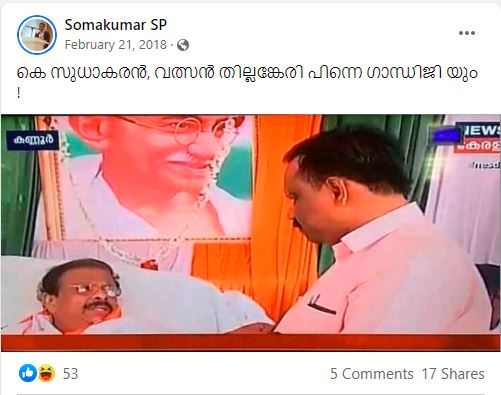 ഈ ഫോട്ടോ റിവേഴ്സ് ഇമേജ് സെർച്ച് നടത്തിയപ്പോൾ ഞങ്ങൾക്ക് Somakumar SP ഫെബ്രുവരി 21 2018 ൽ ഷെയർ ചെയ്ത ഇതേ ഫോട്ടോ കിട്ടി. ‘കെ സുധാകരൻ, വത്സൻ തില്ലങ്കേരി പിന്നെ ഗാന്ധിജിയും,’ എന്ന തലക്കെട്ടിനൊപ്പമാണ് പോസ്റ്റ്. ഇതിൽ നിന്നും 2018ലെത്താണ് ഫോട്ടോ എന്ന് മനസിലായി.