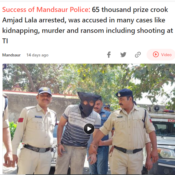 ദൈനിക് ഭാസ്കറിന്റെ റിപ്പോർട്ട് പ്രകാരം “മധ്യപ്രദേശിലെ മന്ദ്സൗറിലെ നയാ അബാദി പോലീസ് തലയ്ക്ക് 65,000 പ്രതിഫലം പ്രഖ്യാപിച്ചിട്ടുള്ള. 6 വർഷമായി ഒളിവിൽ കഴിയുന്ന, കുപ്രസിദ്ധ പ്രതി അംജദ് ലാലയെ അറസ്റ്റ് ചെയ്തു. പ്രതിക്ക് എതിരെ കൊലപാതകം, മോചനദ്രവ്യം ആവശ്യപ്പെട്ട് തട്ടിക്കൊണ്ടുപോകൽ, കള്ളക്കടത്ത് തുടങ്ങിയവ അടക്കം ക്രിമിനൽ കേസുകളുണ്ട്.”