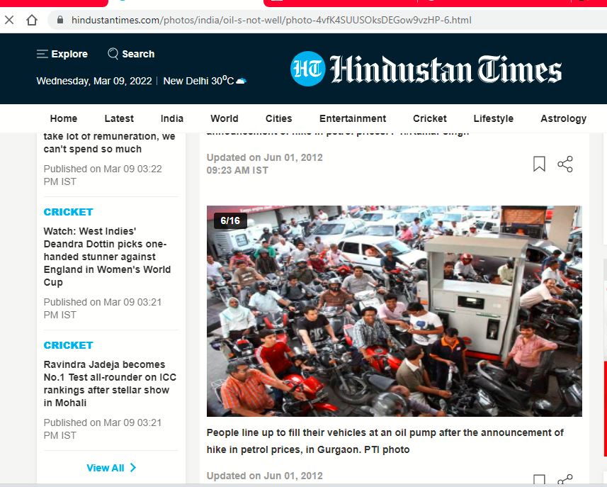 “ഇന്നലെ വൈകിട്ടാണ് ഇന്ധന വില ലിറ്ററിന് 6.28 രൂപ കൂട്ടുമെന്ന് സർക്കാർ പ്രഖ്യാപിച്ചത്. വിലകുറഞ്ഞ് നിൽക്കുന്ന സമയത്ത് പെട്രോൾ വാങ്ങാൻ പെട്രോൾ പമ്പുകളിലേക്ക് ഓടിയെത്തിയ ഇന്ത്യൻ പൊതുജനം ഒരു നിമിഷം പോലും പാഴാക്കിയില്ല,” എന്ന വിവരണത്തോടൊപ്പം പ്രസിദ്ധീകരിച്ച ഒരു ഫോട്ടോ ഫീച്ചറിലാണ് ഈ ചിത്രം ഉള്ളത്. Indian against petrol price hike എന്ന ഫേസ്ബുക്ക് പേജിൽ ജൂൺ 2 2012ൽ ഈ ചിത്രം ഉപയോഗിച്ചിട്ടുണ്ട്.