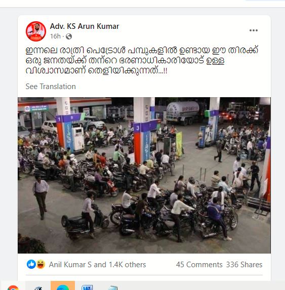 ഈ സാഹചര്യത്തിൽ, “ഇന്നലെ രാത്രി പെട്രോൾ പമ്പുകളിൽ ഉണ്ടായ ഈ തിരക്ക് ഒരു ജനതയ്ക്ക് തന്റെ ഭരണാധികാരിയോട് ഉള്ള വിശ്വാസമാണ് തെളിയിക്കുന്നത്,” എന്നു അവകാശപ്പെടുന്ന ഒരു പോസ്റ്റ് ഷെയർ ചെയ്യപ്പെടുന്നത്. ഈ പോസ്റ്റ് ഷെയർ ചെയ്യുന്നവരെല്ലാം ഒരേ ചിത്രം അല്ല ഉപയോഗിക്കുന്നത്. രണ്ട് വ്യത്യസ്ത ചിത്രങ്ങൾക്കൊപ്പം ഈ പോസ്റ്റ് ഷെയർ ചെയ്യപ്പെടുന്നുണ്ട്. അതിൽ ആദ്യത്തെ ചിത്രം പങ്ക് വെക്കുന്ന, Adv. KS Arun Kumar ന്റെ പോസ്റ്റിന് ഞങ്ങൾ പരിശോധിക്കുന്ന സമയത്ത് 337 ഷെയറുകൾ ഉണ്ടായിരുന്നു.