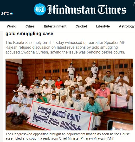 ഈ ചിത്രത്തെ കുറിച്ച് കൂടുതൽ അറിയാൻ പടം ഞങ്ങൾ റിവേഴ്സ് ഇമേജ് സെര്ച്ച് ചെയ്തു. ഹിന്ദുസ്ഥാൻ ടൈംസിന്റെ വെബ്സൈറ്റിൽ നിന്നും ഫെബ്രുവരി 25ലെ വർത്തയ്ക്കൊപ്പമുള്ള പടം കിട്ടി.ഡോളര് കടത്ത് കേസ് മുഖ്യമന്ത്രി മൗനം വെടിയുക.എന്നാണ് ആ പടത്തിലെ ബാനറിൽ എഴുതിയിരിക്കുന്നത്. ഈ ബാനർ എഡിറ്റ് ചെയ്താണ് ഇപ്പോൾ വൈറലായ പടം പോസ്റ്റ് ചെയ്തിരിക്കുന്നത് എന്ന് മനസിലായി.