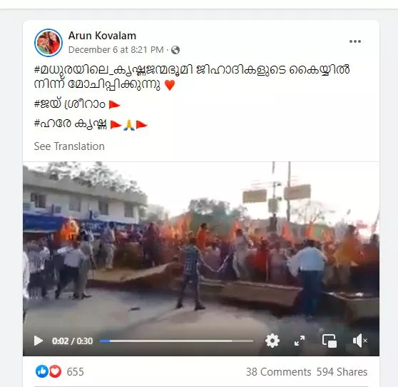 മഥുരയിലെ കൃഷ്ണജന്മഭൂമി ജിഹാദികളുടെ കൈയ്യിൽ നിന്ന് മോചിപ്പിക്കുന്നു. ജയ് ശ്രീറാം. ഹരേ കൃഷ്ണ,” എന്ന പേരിൽ ഒരു വീഡിയോ ഫേസ്ബുക്കിൽ വൈറലാവുന്നുണ്ട്. ഉത്തർപ്രദേശിലെ മഥുരയിൽ സ്ഥിതി ചെയ്യുന്ന പള്ളി മാറ്റി സ്ഥലം അമ്പലത്തിനു വിട്ടുനൽകണം എന്ന ആവശ്യവുമായി ബന്ധപ്പെട്ട തർക്കങ്ങളുടെ പശ്ചാത്തലത്തിലാണ് ഈ വീഡിയോ വൈറലാവുന്നത്.