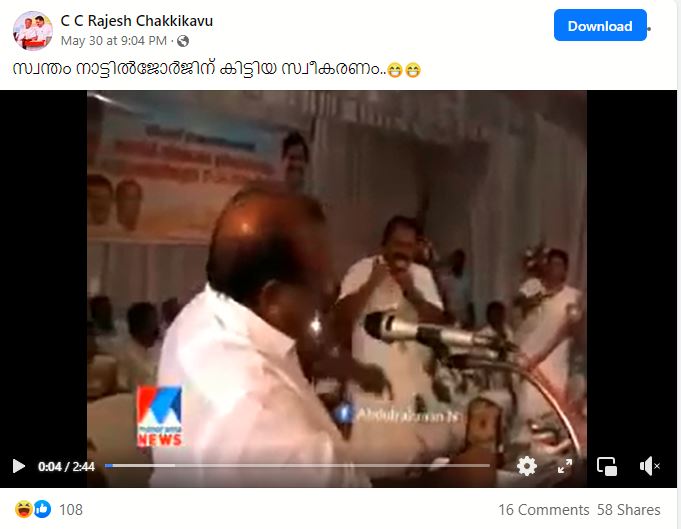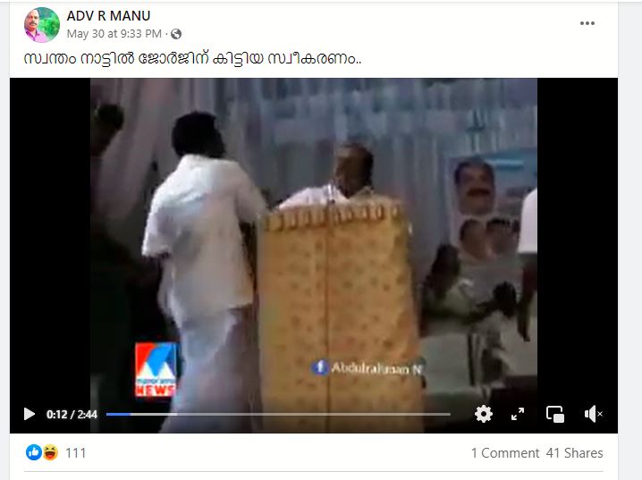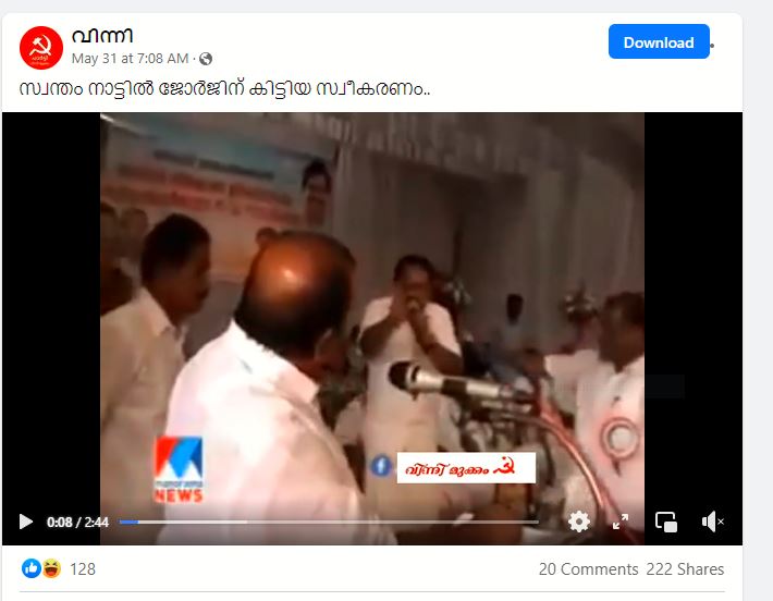 ഈ വീഡിയോ,” സ്വന്തം നാട്ടിൽ പി സി ജോർജ്ജിന് കിട്ടിയ സ്വീകരണത്തിന്റേതല്ല,”‘എന്ന് ഞങ്ങളുടെ അന്വേഷണത്തിൽ മനസിലായി. 2015ൽ പാലായ്ക്കടുത്ത് തിടനാട്ടിൽ നടന്ന പരിപാടിയുടെ വീഡിയോ ആണത്.