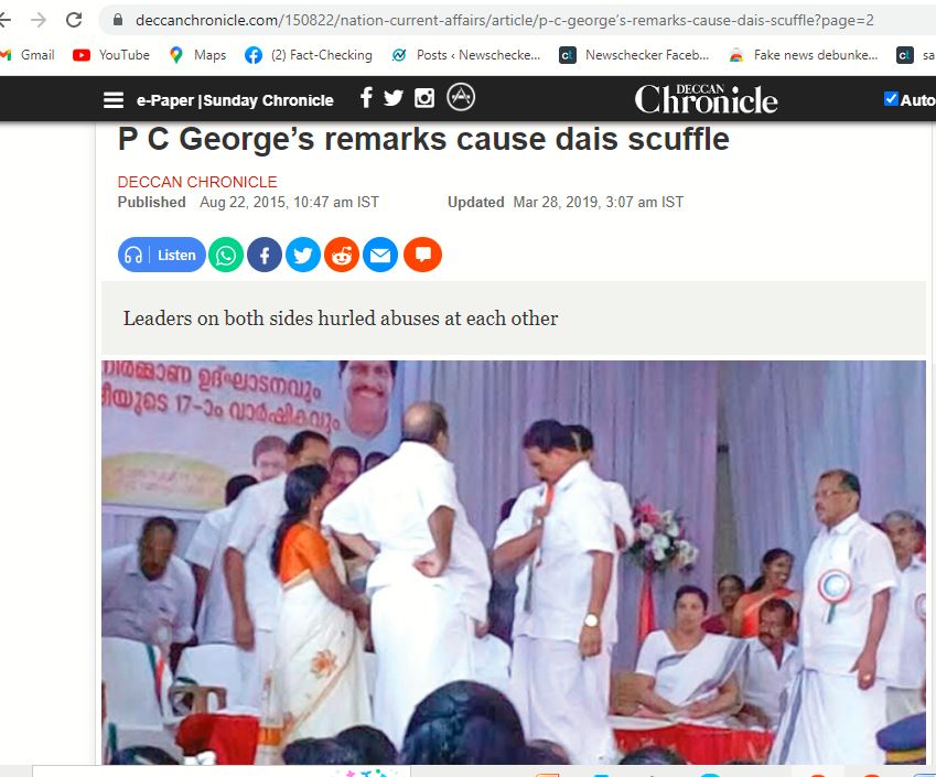 ഞങ്ങൾ വീഡിയോയുടെ ഒരു കീ ഫ്രയിം എടുത്ത് റിവേഴ്സ് ഇമേജ് സേർച്ച് നടത്തി.അപ്പോൾ മനോരമ ന്യൂസ് പ്രസിദ്ധീകരിച്ച വീഡിയോയുടെ ലിങ്ക് ഞങ്ങള്ക്ക് കിട്ടി. 2015 ഓഗസ്റ്റ് 21 ന് നടന്ന പരിപാടിയുടേതാണ് വീഡിയോ. അന്ന് കോൺഗ്രസ്സ് നേതൃത്വത്തിലുള്ള യുഡിഎഫ് മുന്നണി കേരളത്തിൽ അധികാരത്തിൽ ഇരിക്കുന്ന കാലമാണ്. ഉമ്മൻചാണ്ടിയുടെ നേതൃത്വത്തിലുള്ള ആ മുന്നണിയുടെ ഭാഗമായിരുന്നു പി സി ജോർജ്ജ്. അതെ മന്ത്രിസഭയിലെ ധനകാര്യ മന്ത്രിയായിരുന്ന കെഎം മാണിയ്ക്കെതിരെ അദ്ദേഹം നടത്തിയ പരാമർശമാണ് കയ്യാങ്കളിക്ക് കാരണമായത്.