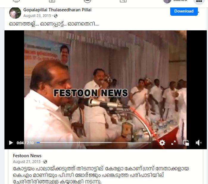 Gopalapillai Thulaseedharan Pillai എന്ന ആൾ ഓഗസ്റ്റ് 23, 2015 ന് ഷെയർ ചെയ്ത ഒരു വീഡിയോയും ഞങ്ങൾക്ക് കിട്ടി.