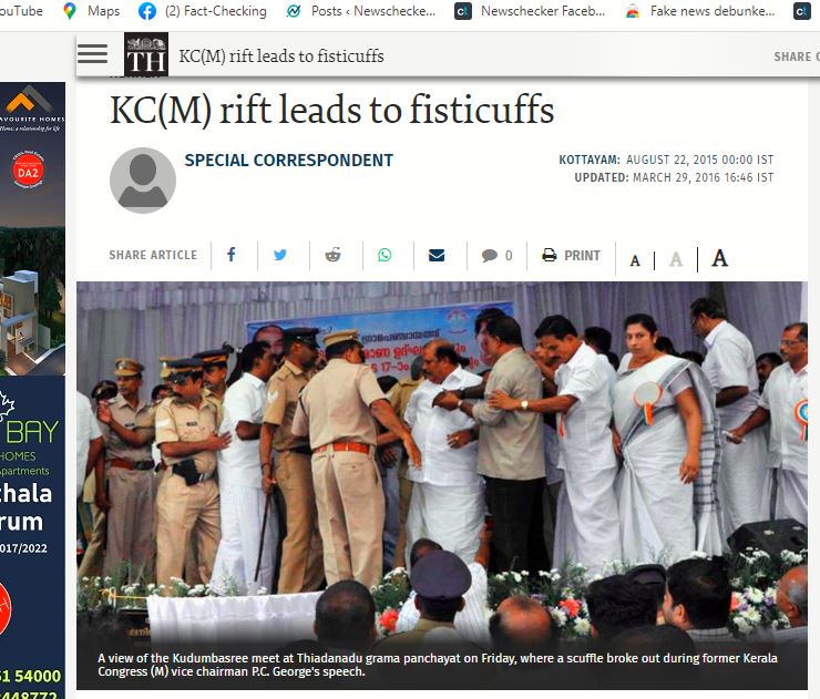 പോസ്റ്റിലെ വിവരണം ഇങ്ങനെയാണ്:”കോട്ടയം പാലായ്ക്കടുത്ത് തിടനാട്ടിൽ കേരളാ കോൺഗ്രസ് നേതാക്കളായ കെ.എം മാണിയും പി.സി ജോര്ജ്ജും പങ്കെടുത്ത പരിപാടിയിൽ ചേരിതിരിഞ്ഞുള്ള കയ്യാങ്കളി നടന്നു.”