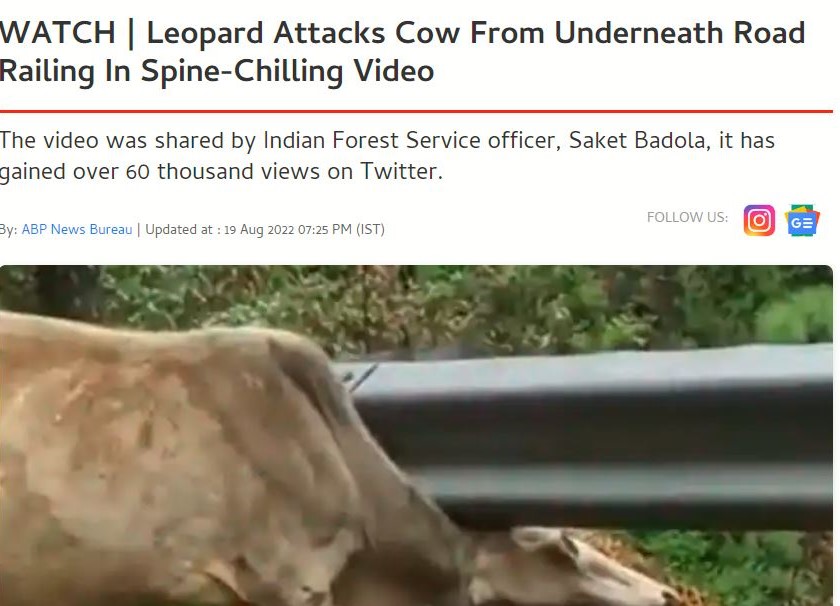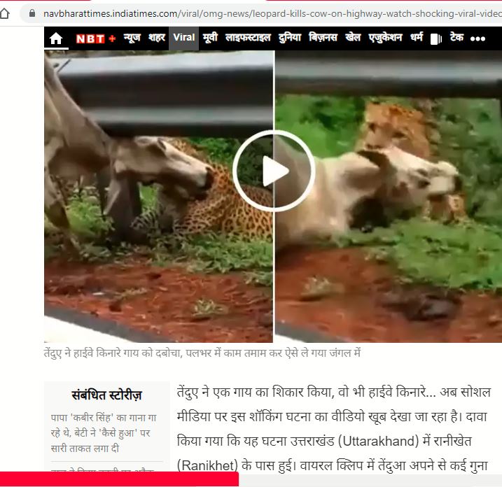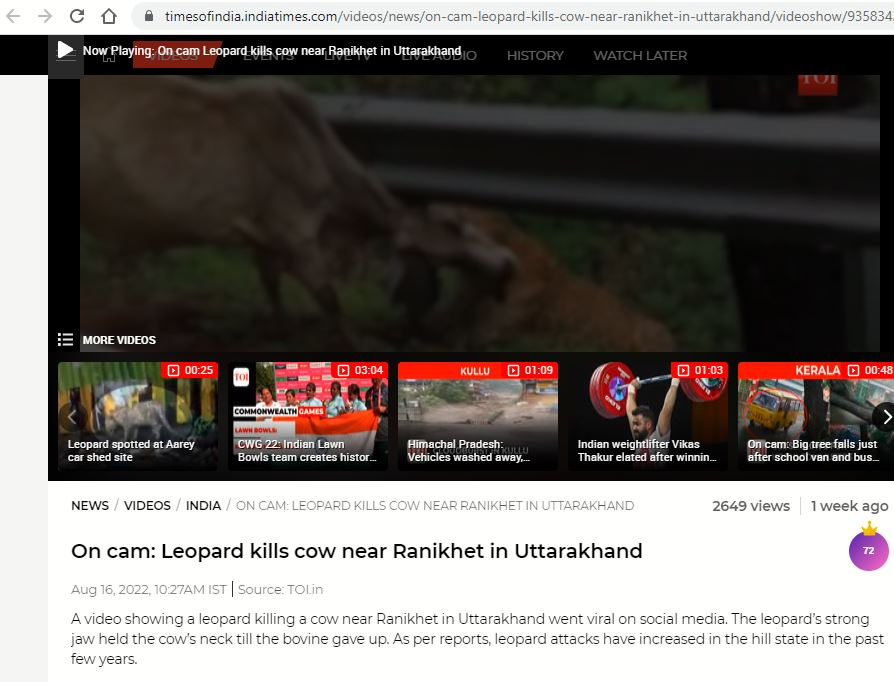 ”കാമറയിൽ: ഉത്തരാഖണ്ഡിലെ റാണിഖേത്തിന് സമീപം പുള്ളിപ്പുലി പശുവിനെ കൊന്നു,” എന്ന തലക്കെട്ടോടെ ടൈംസ് ഓഫ് ഇന്ത്യ വീഡിയോ ആഗസ്റ്റ് 16 2022ൽ പ്രസീദ്ധീരികരിച്ചിട്ടുണ്ട്.