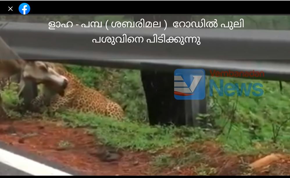 ശബരിമല-പമ്പ റോഡിൽ പശുവിനെ പുലി പിടിക്കുന്നു എന്ന പേരിൽ ഒരു വീഡിയോ ഫേസ്ബുക്കിൽ പ്രചരിക്കുന്നുണ്ട്. 30 സെക്കന്റ് ദൈർഘ്യമുള്ള വീഡിയോയിൽ പശുവിന്റെ കഴുത്തിൽ പുലി പിടുത്തമിടുകയും റോഡിന്റെ അതിരിലുള്ള റയിൽസിനടിയിലേക്ക് അതിനെ വലിച്ച് കൊണ്ടു പോകുകയും ചെയ്യുന്നത് കാണാം. പുലിയുടെ ശ്രദ്ധ മാറ്റാൻ വേണ്ടി ഒരു യാത്രകാരൻ ബഹളം വെക്കുന്നതും വാഹനത്തിന്റെ ഹോൺ മുഴക്കുന്നതും ഒപ്പം കേൾക്കാം.