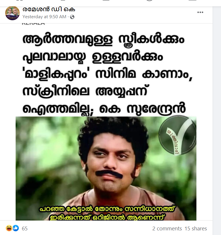 മാളികപ്പുറം സിനിമയെ കുറിച്ചുള്ള റിപ്പോർട്ടർ ടിവിയുടെ ന്യൂസ്കാർഡ് വ്യാജമാണ് എന്ന് ഇതിൽ നിന്നും മനസിലായി.