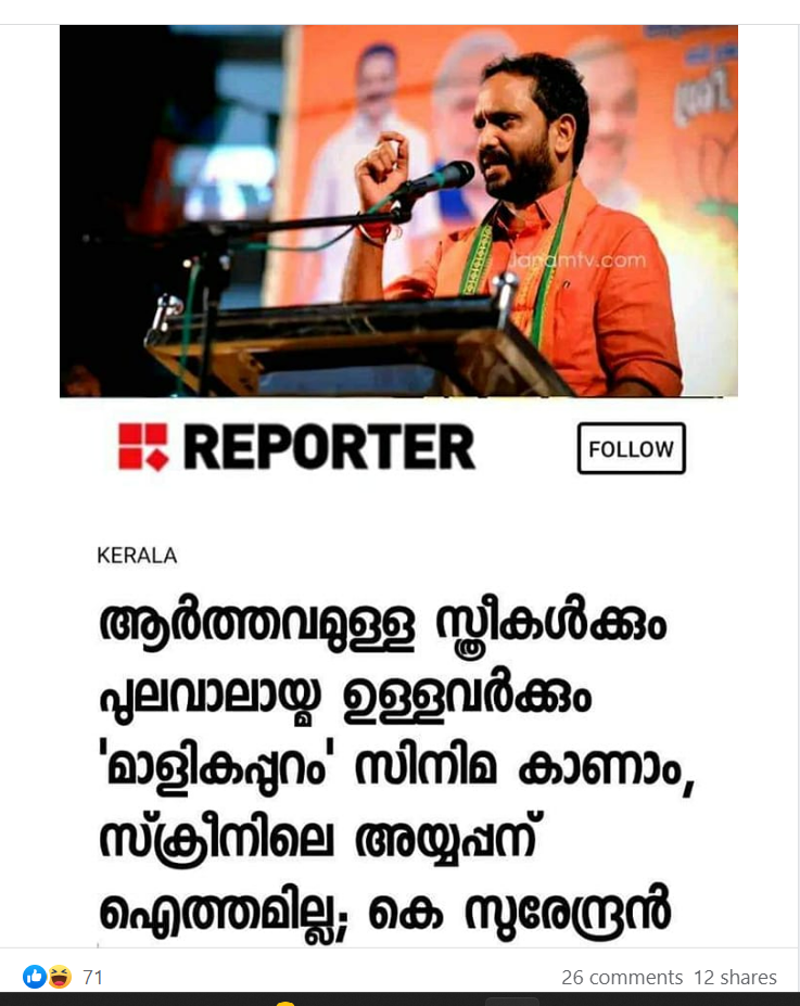 “ആർത്തവമുള്ള സ്ത്രീകൾക്കും പുലവാലായ്മ ഉള്ളവർക്കും മാളികപ്പുറം സിനിമ കാണാം. സ്ക്രീനിലെ അയ്യപ്പന് അയിത്തമില്ല…” കെ സുരേന്ദ്രന്റെ പേരിലുള്ള ന്യൂസ്കാർഡിലുള്ളത് ഈ വാചകമാണ്.