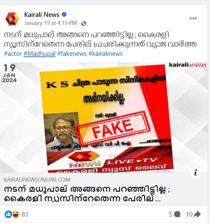 ഞങ്ങൾ കീ വേർഡ് സേർച്ച് സേർച്ച് ചെയ്തപ്പോൾ അത്തരം ഒരു ന്യൂസ്കാർഡ് കൈരളി ടിവി കൊടുത്തത് കണ്ടെത്താനായില്ല. പോരെങ്കിൽ,”നടൻ മധുപാൽ അങ്ങനെ പറഞ്ഞിട്ടില്ല; കൈരളി ന്യൂസിന്റേതെന്ന പേരിൽ പ്രചരിക്കുന്നത് വ്യാജ വാർത്ത,” എന്ന് വ്യക്തമാക്കുന്ന കൈരളി ടിവിയുടെ ജനുവരി 19,2024യിലെ ഫേസ്ബുക്ക് പോസ്റ്റ് ഞങ്ങൾ കണ്ടു.