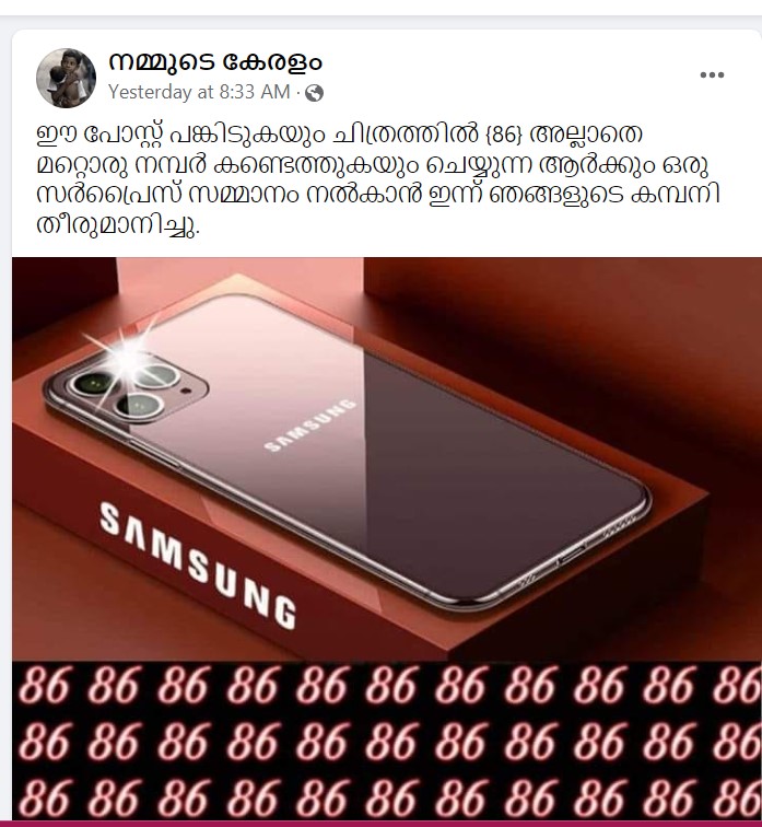“ഈ പോസ്റ്റ് പങ്കിടുകയും ചിത്രത്തിൽ {86} അല്ലാതെ മറ്റൊരു നമ്പർ കണ്ടെത്തുകയും ചെയ്യുന്ന ആർക്കും ഒരു സർപ്രൈസ് സമ്മാനം നൽകാൻ ഇന്ന് ഞങ്ങളുടെ കമ്പനി തീരുമാനിച്ചു. നിങ്ങളുടെ പേര് സ്ഥിരീകരിക്കാൻ മറക്കരുത്,” എന്ന പേരിൽ ഒരു പോസ്റ്റ് പ്രചരിക്കുന്നുണ്ട്.. സാംസങ് കമ്പനിയുടെ പേരിലാണ പോസ്റ്റ്.