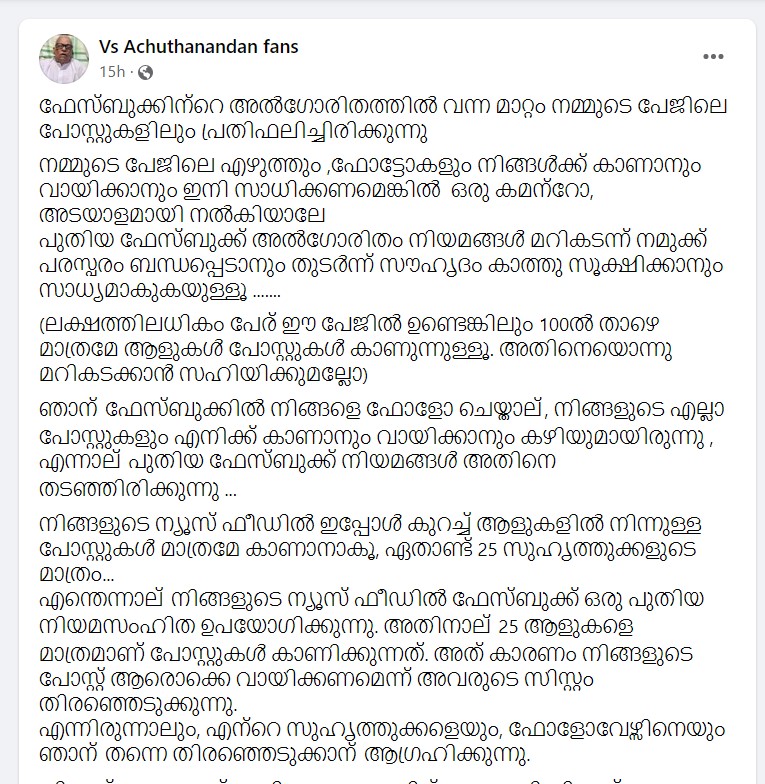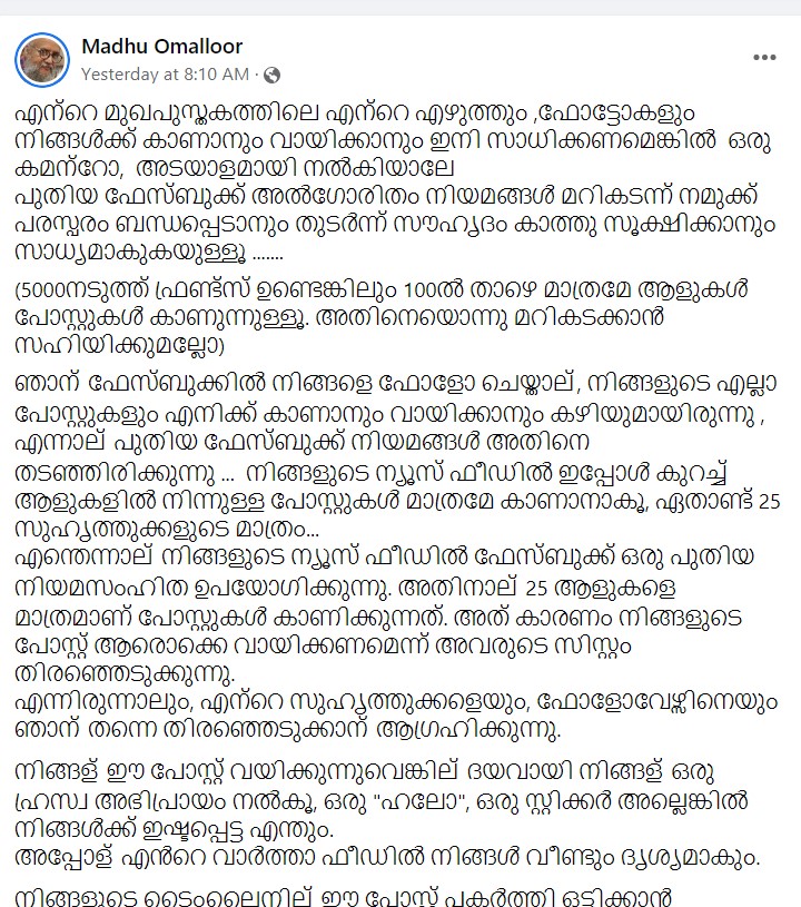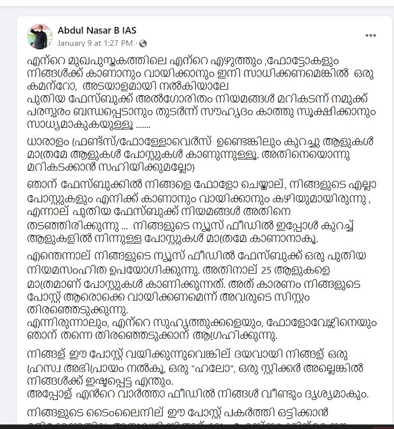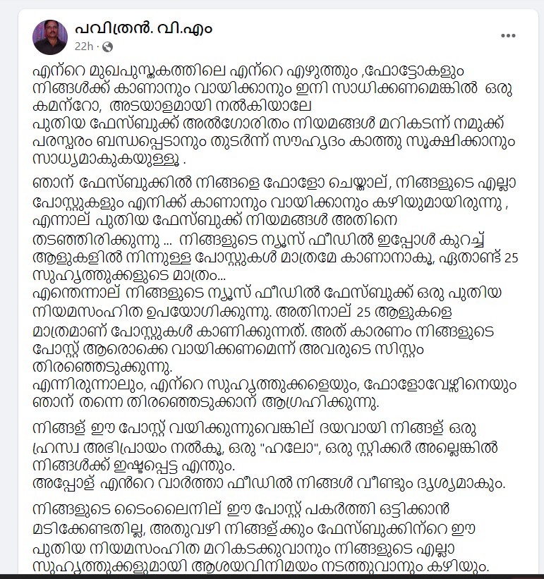 “പുതിയ ഫേസ്ബുക്ക് അൽഗോരിതം നിയമങ്ങൾ മറികടന്ന് നമുക്ക് പരസ്പരം ബന്ധപ്പെടാനും തുടർന്ന് സൗഹൃദം കാത്തു സൂക്ഷിക്കാനും സാധ്യമാകുകയുള്ളൂ. (5000നടുത്ത് ഫ്രണ്ട്സ് ഉണ്ടെങ്കിലും 100ൽ താഴെ മാത്രമേ ആളുകൾ പോസ്റ്റുകൾ കാണുന്നുള്ളൂ. അതിനെയൊന്നു മറികടക്കാൻ സഹിയിക്കുമല്ലോ.)