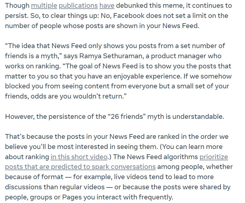 “ഞാൻ ഫേസ്ബുക്കിൽ നിങ്ങളെ ഫോളോ ചെയ്താൽ, നിങ്ങളുടെ എല്ലാ പോസ്റ്റുകളും എനിക്ക് കാണാനും വായിക്കാനും കഴിയുമായിരുന്നു , എന്നാൽ പുതിയ ഫേസ്ബുക്ക് നിയമങ്ങൾ അതിനെ തടഞ്ഞിരിക്കുന്നു. നിങ്ങളുടെ ന്യൂസ് ഫീഡിൽ ഇപ്പോൾ കുറച്ച് ആളുകളിൽ നിന്നുള്ള പോസ്റ്റുകൾ മാത്രമേ കാണാനാകൂ, ഏതാണ്ട് 25 സുഹൃത്തുക്കളുടെ മാത്രം.