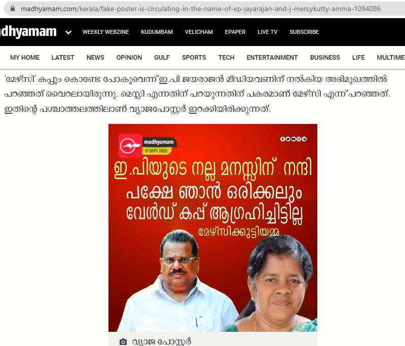 മാധ്യമം വെബ്സൈറ്റ് ഇ.പി.ജയരാജന്റെയും മെഴ്സിക്കുട്ടിയമ്മയുടെയും പേരില് പ്രചരിക്കുന്നത് വ്യാജ പോസ്റ്ററാണെന്ന് റിപ്പോര്ട്ട് ചെയ്തിട്ടുണ്ട്.”എൽ.ഡി.എഫ് കൺവീനർ ഇ.പി. ജയരാജന്റെയും മേഴ്സിക്കുട്ടിയമ്മയുടെ പേരിൽ ‘മാധ്യമ’ത്തിന്റേതെന്ന പേരിൽ പ്രചരിക്കുന്നത് വ്യാജപോസ്റ്റർ. കപ്പും കൊണ്ടേ പോകൂവെന്ന് ഇ.പി ജയരാജൻ മീഡിയവണിന് നൽകിയ അഭിമുഖത്തിൽ പറഞ്ഞത് വൈറലായിരുന്നു.മെസ്സി എന്നതിന് പറയുന്നതിന് പകരമാണ് മേഴ്സി എന്ന് പറഞ്ഞത്. ഇതിന്റെ പശ്ചാത്തലത്തിലാണ് വ്യാജപോസ്റ്റർ ഇറക്കിയിരിക്കുന്നത്,” മാധ്യമം വ്യക്തമാക്കുന്നു.