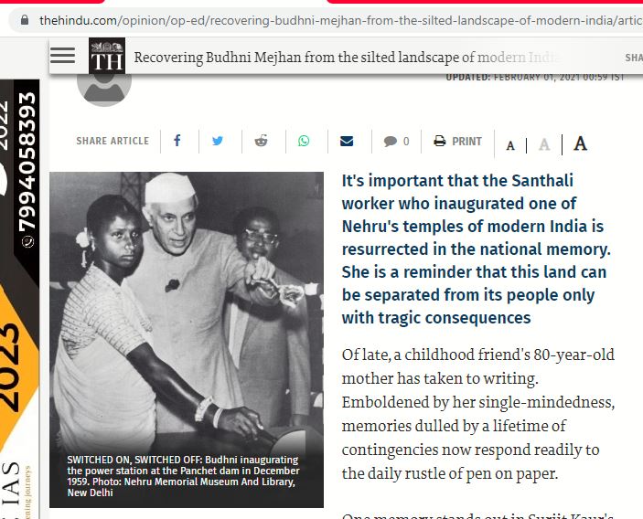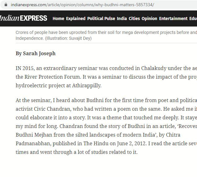 ഇന്ത്യൻ എക്സ്പ്രസിൽ താൻ ബുധ്നിയെ കണ്ട കഥ സാറ ജോസഫ് എഴുതിയിട്ടുണ്ട്. ഹീരാക്കുഡ് ഡാമിന്റെത് എന്ന പേരിൽ പ്രചരിക്കുന്ന ഉദ്ഘാടനം വാസ്തവത്തിൽ പാഞ്ചേത് അണക്കെട്ടിന്റെതാണ് എന്ന് ഇതിൽ നിന്നെല്ലാം വ്യക്തമാണ്.