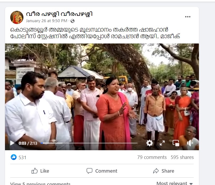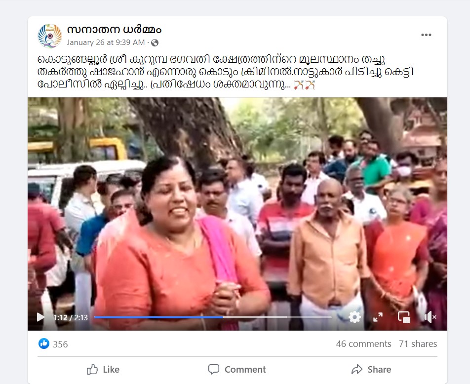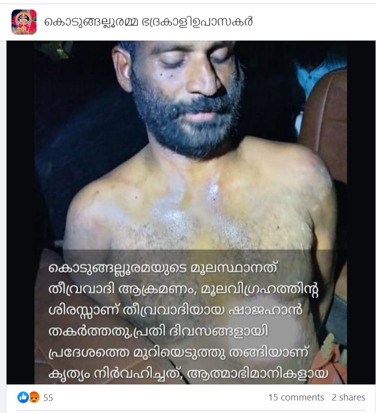 അതിനെ തുടർന്ന്, “കൊടുങ്ങല്ലൂർ ശ്രീ കുറുമ്പ ഭഗവതി ക്ഷേത്രത്തിന്റെ മൂലസ്ഥാനം തച്ചു തകർത്തു ഷാജഹാൻ എന്നൊരു കൊടും ക്രിമിനൽ.നാട്ടുകാർ പിടിച്ചു കെട്ടി പോലീസിൽ ഏല്പിച്ചു. പ്രതിഷേധം ശക്തമാവുന്നു” എന്ന പേരിൽ ഒരു പോസ്റ്റ് വൈറലാവുന്നുണ്ട്. വർഗീയമായ ഉള്ളടക്കത്തോടെയാണ് പോസ്റ്റ് ഷെയർ ചെയ്യപ്പെട്ടുന്നത്.