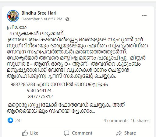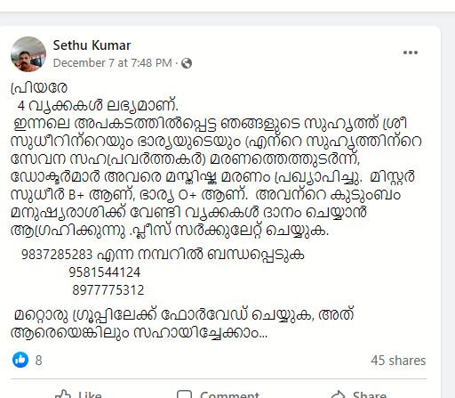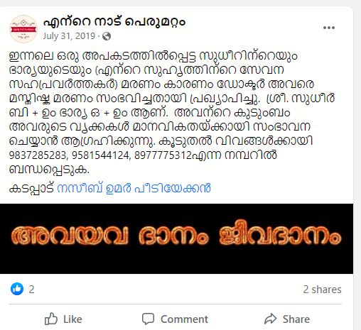 ‘അപകടത്തിൽ മരിച്ച സുധീറിന്റെയും ഭാര്യയുടെയും വൃക്കകൾ ദാനം ചെയ്യുന്നുവെന്ന,’ പോസ്റ്റ് വ്യാജമാണ്