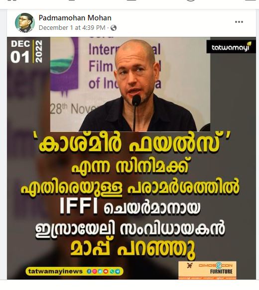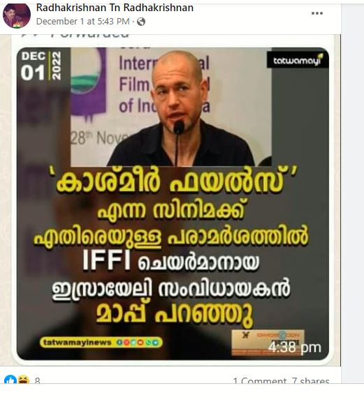 നടൻ അനുപം ഖേറും മറ്റ് പല ട്വിറ്റർ ഹാൻഡിലുകളും ഉൾപ്പെടെ നിരവധി സോഷ്യൽ മീഡിയ ഉപയോക്താക്കൾ ഇസ്രായേലി ചലച്ചിത്ര സംവിധായകൻ നദവ് ലാപിഡ് ‘ദി കശ്മീർ ഫയൽസി’നെക്കുറിച്ചുള്ള തന്റെ നിലപാട് മാറ്റി, അതിനെ ഒരു മികച്ച സിനിമയാണെന്ന് വിശേഷിപ്പിച്ചുവെന്നാണ് സമൂഹ മാധ്യമങ്ങളിൽ നടക്കുന്ന പ്രചരണം. ഇന്റർനാഷണൽ ഫിലിം ഫെസ്റ്റിവൽ ഓഫ് ഇന്ത്യ (ഐഐഎഫ്എ) ജൂറി ചെയർപേഴ്സണായി സേവനമനുഷ്ഠിച്ച ലാപിഡ്, ഒമ്പത് ദിവസത്തെ ചലച്ചിത്രമേളയുടെ സമാപന രാത്രിയായ നവംബർ 28ന് ഗോവയിൽ അവാർഡ് ദാന ചടങ്ങിൽ നടത്തിയ പ്രസംഗത്തിൽ “ദി കശ്മീർ ഫയൽസ്” “ പ്രചാരണം നിറഞ്ഞ അശ്ളീല” സിനിമയാണെന്ന് പറഞ്ഞിരുന്നു.