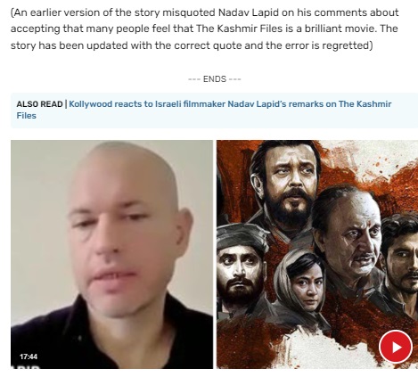 ലേഖനത്തിന്റെ അവസാനത്തിൽ ഒരു തിരുത്തും ഞങ്ങൾ ശ്രദ്ധിച്ചു, “കശ്മീർ ഫയൽസ് ഒരു മികച്ച സിനിമയാണെന്ന് പലർക്കും തോന്നുന്നത് അംഗീകരിക്കുന്നതിനെക്കുറിച്ചുള്ള നദവ് ലാപിഡിന്റെ അഭിപ്രായത്തെക്കുറിച്ച് കഥയുടെ മുൻ പതിപ്പ് തെറ്റായി ഉദ്ധരിച്ചിരിക്കുന്നു. ശരിയായ ഉദ്ധരണി ഉപയോഗിച്ച് സ്റ്റോറി അപ്ഡേറ്റുചെയ്തു. പിശകിൽ ഖേദിക്കുന്നു.”