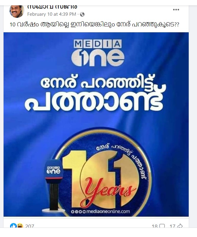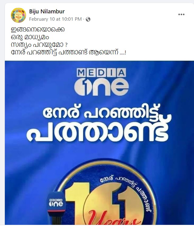 ‘നേര് പറഞ്ഞിട്ട് പത്ത് വർഷം,’ എന്ന് എഴുതിയിട്ടുള്ള ഒരു മീഡിയവൺ ന്യൂസ്കാർഡ് ഫേസ്ബുക്കിൽ വ്യാപകമായി പ്രചരിക്കുന്നുണ്ട്. മീഡിയവൺ ന്യൂസ് ചാനൽ പത്താം പിറന്നാള് ആഘോഷിക്കുന്ന വേളയിലാണ് ഇത്തരം ഒരു ന്യൂസ് കാർഡ് വൈറലാവുന്നത്.