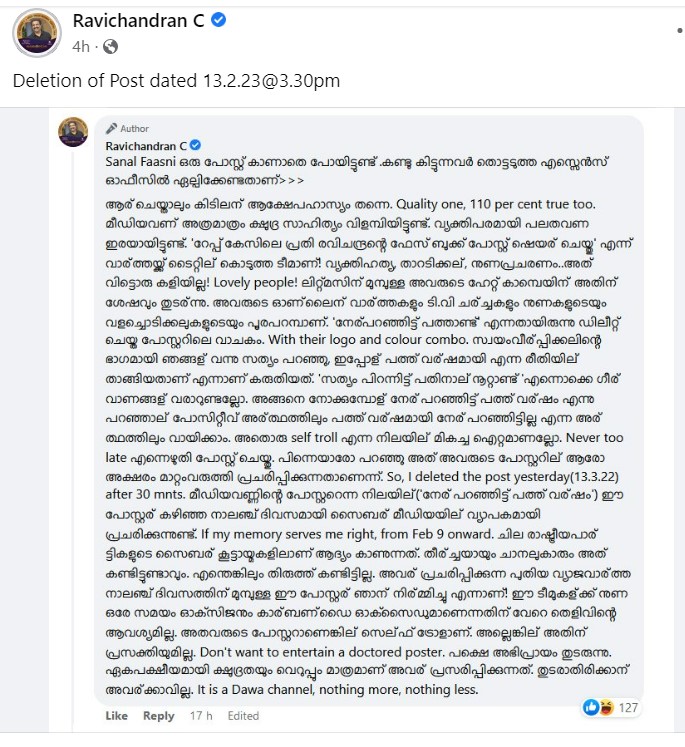 സി. രവിചന്ദ്രന്റെ ഫേസ്ബുക്ക് പേജിൽ പോയപ്പോൾ അദ്ദേഹം പ്രചരിക്കുന്ന പോസ്റ്റ് ഡിലീറ്റ് ചെയ്തുവെന്ന് വ്യക്തമാക്കുന്ന പോസ്റ്റ് അദ്ദേഹം ഇട്ടിട്ടുണ്ടെന്ന് എന്ന് മനസിലായി. “deletion of Post dated 13.2.23@3.30pm,” എന്ന തലക്കെട്ടിലാണ് പോസ്റ്റ്. പോസ്റ്റർ മീഡിയവൺ തയ്യാറാക്കിയതല്ലെന്ന് എന്ന് ബോധ്യപ്പെട്ടതിനാലാണ് മീഡിയവൺ ന്യൂസ്കാർഡ് ഉപയോഗിച്ചുള്ള പോസ്റ്റ് പിൻവലിക്കുന്നത് എന്നാണ് രവിചന്ദ്രൻ ആ പോസ്റ്റിൽ പറയുന്നത്.