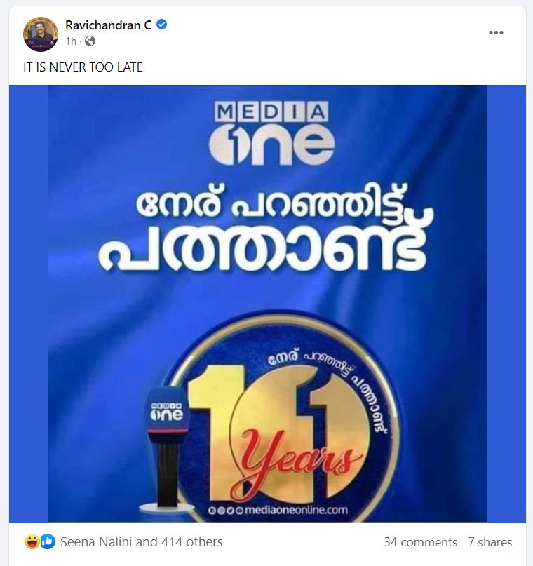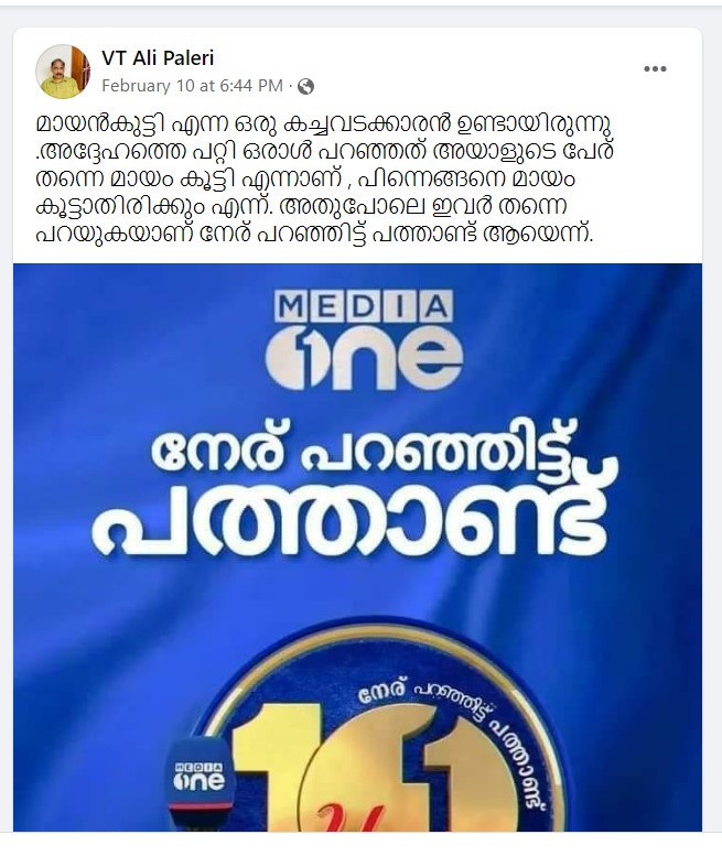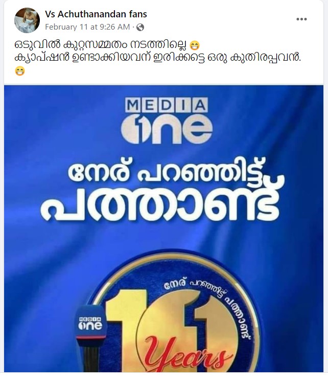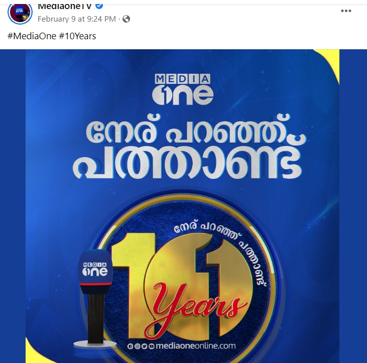 ഞങ്ങൾ ആദ്യം ഇത്തരം ഒരു ന്യൂസ്കാർഡ് മീഡിയവൺ ഷെയർ ചെയ്തിട്ടുണ്ടോ എന്നറിയാൻ അവരുടെ ഫേസ്ബുക്ക് പേജിൽ പോയി നോക്കി. അപ്പോൾ അവരുടെ ശരിയായ ന്യൂസ്കാർഡ് ലഭിച്ചു. ‘നേര് പറഞ്ഞ് പത്താണ്ട്’ എന്നാണ് തലവാചകത്തിൽ മീഡിയവൺ ന്യൂസ്കാർഡിൽ എഴുതിയിരിക്കുന്നത്.
