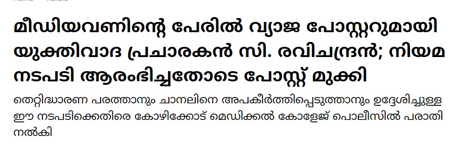 ഞങ്ങൾ തുടർന്ന് ഇതിനെ സംബന്ധിക്കുന്ന എന്തെങ്കിലും വർത്തയുണ്ടോ എന്നറിയാൻ മീഡിയവൺ വെബ്സൈറ്റ് സന്ദർശിച്ചു. അപ്പോൾ ഒരു വാർത്ത കണ്ടു. വാർത്ത പറയുന്നത് ഇങ്ങനെ: “മീഡിയവണിന്റെ സോഷ്യൽ മീഡിയ കാർഡിൽ തിരുത്തൽ വരുത്തി വ്യാജ പ്രചരണം നടത്തിയ യുക്തിവാദി നേതാവ് സി. രവിചന്ദ്രനെതിരെ മീഡിയവൺ പൊലീസിൽ പരാതി നൽകി. പത്താം വാർഷികാഘോഷത്തിന്റെ ഭാഗമായി ‘നേര് പറഞ്ഞ് പത്താണ്ട്’ എന്ന തലവാചകത്തിൽ മീഡിയവൺ പ്രസിദ്ധീകരിച്ച സോഷ്യൽ മീഡിയ കാർഡ് ആണ് യുക്തിവാദി നേതാവ് എഡിറ്റിങ്ങ് സോഫ്റ്റ്വെയർ ഉപയോഗിച്ച് തിരുത്തുകയും തന്റെ ഫേസ്ബുക്ക് പേജിൽ പ്രസിദ്ധീകരിക്കുകയും ചെയ്തത്. തെറ്റിദ്ധാരണ പരത്താനും ചാനലിനെ അപകീർത്തിപ്പെടുത്താനും ഉദ്ദേശിച്ചുള്ള ഈ നടപടിക്കെതിരെ കോഴിക്കോട്മെഡിക്കൽ കോളേജ് പോലീസിൽ പരാതി നൽകിയതായി മീഡിയവൺ കോർപറേറ്റ് കമ്മ്യൂണിക്കേഷൻസ് സീനിയർ മാനേജർ പി.ബി.എം ഫർമിസ് പറഞ്ഞു. ചാനലിന്റെ ലോഗോ ദുരുപയോഗം ചെയ്തതിനെതിരെയും നിയമ നടപടികൾ സ്വീകരിക്കുന്നുണ്ട്,” വാർത്ത പറയുന്നു. “നിയമ നടപടി ആരംഭിച്ചതോടെ പോസ്റ്റ് മുക്കി,” എന്നും വാർത്ത പറയുന്നു.