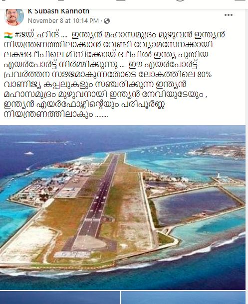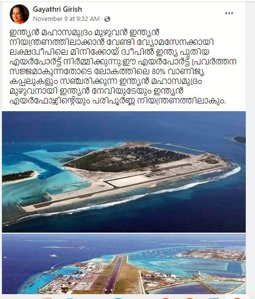 മിനിക്കോയ് വിമാനത്താവളം എന്ന അവകാശവാദത്തോടെ ഒരു ഫോട്ടോകൾ ഫേസ്ബുക്കിൽ വ്യാപകമായി പ്രചരിക്കുന്നുണ്ട്.” ഇന്ത്യൻ മഹാസമുദ്രം മുഴുവൻ ഇന്ത്യൻ നിയന്ത്രണത്തിലാക്കാൻ വേണ്ടി വ്യോമസേനക്കായി ലക്ഷദ്വീപിലെ മിനിക്കോയ് ദ്വീപിൽ ഇന്ത്യ പുതിയ എയർപോർട്ട് നിർമ്മിക്കുന്നു. ഈ എയർപോർട്ട് പ്രവർത്തന സജ്ജമാകുന്നതോടെ ലോകത്തിലെ 80% വാണിജ്യ കപ്പലുകളും സഞ്ചരിക്കുന്ന ഇന്ത്യൻ മഹാസമുദ്രം മുഴുവനായി ഇന്ത്യൻ നേവിയുടേയും, ഇന്ത്യൻ എയർഫോഴ്സിൻ്റെയും പരിപൂർണ്ണ നിയന്ത്രണത്തിലാകും.” എന്നാണ് പോസ്റ്റുകൾ പറയുന്നത്.