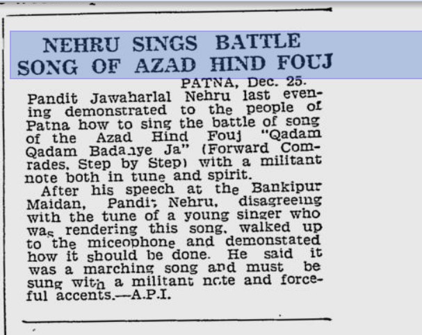 1945 ഡിസംബർ 27 ലെ ഇന്ത്യൻ എക്സ്പ്രസിന്റെ റിപ്പോർട്ട് അനുസരിച്ച് ജവഹർലാൽ നെഹ്റു 1945 ഡിസംബർ 25 ന് ബിഹാറിലെ പട്നയിലായിരുന്നു. അതേ ദിവസം, നെഹ്റു അലഹബാദിലേക്ക് പോയിരുന്നു. നെഹ്റു അടുത്ത ദിവസങ്ങളിൽ അലഹബാദിലുണ്ടായിരുന്നു. 1945 ഡിസംബർ 28-ന് ഇന്ത്യൻ എക്സ്പ്രസിന്റെ ഒരു വാർത്താ റിപ്പോർട്ടിൽ നിന്ന് ഇത് വ്യക്തമാണ്.