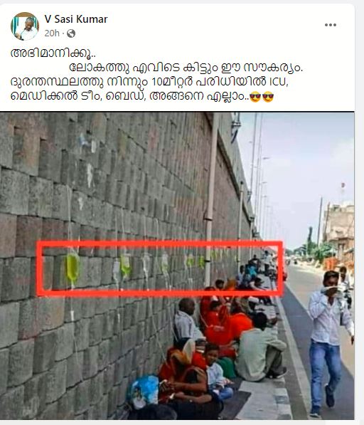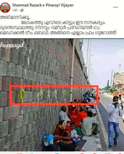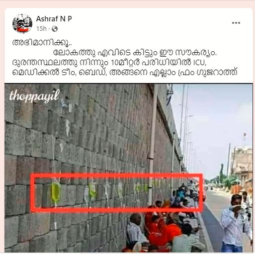 ” അഭിമാനിക്കൂ.ലോകത്തു എവിടെ കിട്ടും ഈ സൗകര്യം. ദുരന്തസ്ഥലത്തു നിന്നും 10മീറ്റർ പരിധിയിൽ ICU, മെഡിക്കൽ ടീം, ബെഡ്, അങ്ങനെ എല്ലാം,” എന്ന വിവരണത്തോടെയാണ് പ്രചരണം.പോസ്റ്റിൽ മോർബി അപകടത്തെ കുറിച്ച് ഒന്നും നേരിട്ട് പറയുന്നില്ലെങ്കിലും ദുരന്തസ്ഥലത്തെ കുറിച്ചുള്ള പോസ്റ്റിലെ സൂചന ആ അപകടത്തെക്കുറിച്ചാണ് പറയുന്നത് എന്ന് സൂചിപ്പിക്കുന്നു.