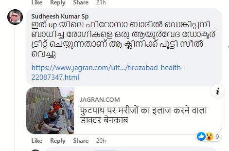 ഫേസ്ബുക്കിൽ ഈ വിഷയത്തെ കുറിച്ചുള്ള ഒരു പോസ്റ്റിൽ,”ഇത് യുപിയിലെ ഫിറോസാബാദിൽ ഡെങ്കിപ്പനി ബാധിച്ച രോഗികളെ ഒരു ആയുർവേദ ഡോക്ടർ ട്രീറ്റ് ചെയ്യുന്നതാണ് ആ ക്ലിനിക്ക് പൂട്ടി സീൽ വെച്ചു,” എന്ന ഒരാളുടെ കമന്റ് ഞങ്ങൾ ശ്രദ്ധിച്ചു. അതിനൊപ്പം ഇതേ പടം പങ്ക് വെച്ച് കൊണ്ട് ജാഗരൺ എന്ന ഹിന്ദി വെബ്സൈറ്റ് ഒക്ടോബർ 6 2021ൽ പ്രസിദ്ധികരിച്ച റിപ്പോർട്ടും കിട്ടി.
