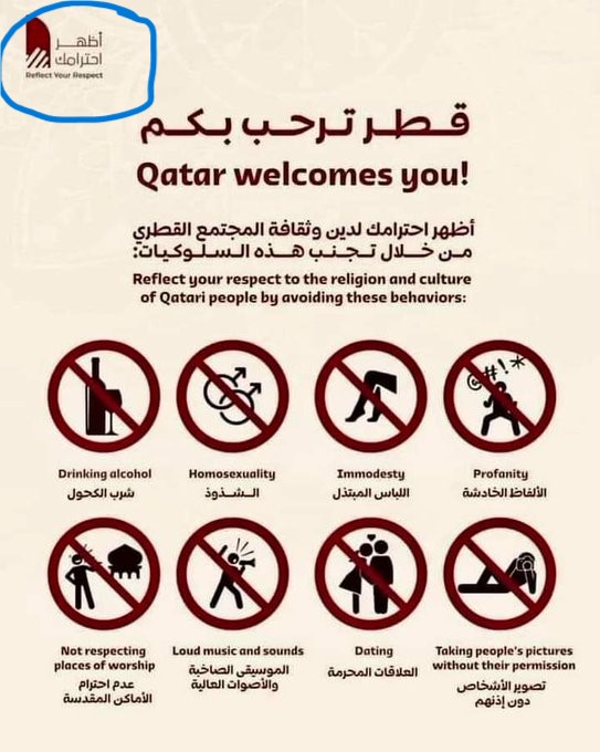 ഖത്തറിൽ സിഗരറ്റ് വലിക്കുന്നത് നിയമവിധേയമാണെങ്കിലും മ്യൂസിയങ്ങൾ, സ്പോർട്സ് ക്ലബ്ബുകൾ, ഷോപ്പിംഗ് മാളുകൾ, റെസ്റ്റോറന്റുകൾ തുടങ്ങി എല്ലാ പൊതു ഇടങ്ങളിലും സിഗരറ്റ് വലിക്കുന്നത് നിരോധിച്ചിട്ടുണ്ടെന്നും ലേഖനത്തിൽ പറയുന്നു. നിയമലംഘകരിൽ നിന്നും പിഴ ചുമത്തും. തോൾ ഭാഗം മറച്ചുകൊണ്ടുള്ള “വിനയത്തോടെ” വസ്ത്രം ധരിക്കാൻ ആരാധകരോട് ഉപദേശിച്ചിട്ടുണ്ടെന്ന് ഖത്തർ ടൂറിസം അതോറിറ്റിയെ ഉദ്ധരിച്ച് റിപ്പോർട്ട് പറയുന്നു.