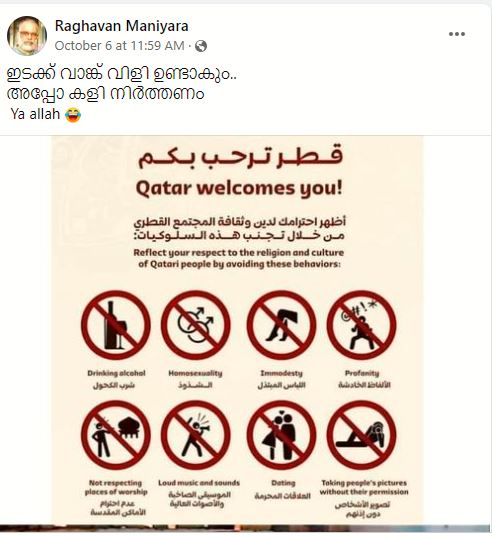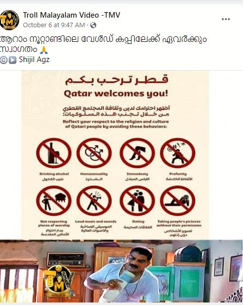 2022-ൽ ഖത്തറിൽ നടക്കുന്ന ഫിഫ ലോകകപ്പ് സംഘാടക സമിതി പുറത്തിറക്കിയതെന്ന് അവകാശപ്പെടുന്ന ഒരു ഇൻഫോഗ്രാഫിക് ഫേസ്ബുക്കിൽ വൈറലാവുന്നുണ്ട്. മദ്യപാനം, ഉച്ചത്തിലുള്ള സംഗീതം, ശബ്ദങ്ങൾ എന്നിവയൊക്കെ ഉപേക്ഷിക്കാൻ ആരാധകരെ ഉപദേശിച്ചുകൊണ്ടുള്ളതാണ് ഈ ഇൻഫോഗ്രാഫിക്. “ഖത്തറികളുടെ മതത്തെയും സംസ്കാരത്തെയും ബഹുമാനിക്കാൻ” ആരാധകരോട് അതിൽ ആവ്യശ്യപ്പെടുന്നു. നവംബർ 20 ന് ആരംഭിക്കുന്ന 2022 ഫിഫ ലോകകപ്പിന് മുന്നോടിയായി ഖത്തർ ഫുട്ബോൾ ആരാധകർക്കായി നിശ്ചയിച്ചിട്ടുള്ള നിയമങ്ങളാണെന്ന് അവകാശപ്പെട്ടു കൊണ്ട് നിരവധി ഉപയോക്താക്കൾ ഇൻഫോഗ്രാഫിക് പങ്കിട്ടു.