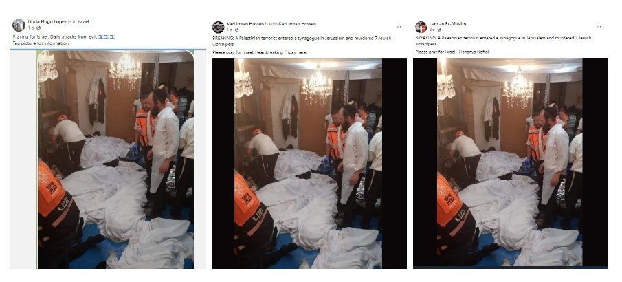 വെള്ളിയാഴ്ച ജറുസലേമിലെ സിനഗോഗിന് പുറത്ത് ഒരു തോക്കുധാരി നടത്തിയ വെടിവയ്പ്പിൽ ഏഴ് പേർ കൊല്ലപ്പെടുകയും മൂന്ന് പേർക്ക് പരിക്കേൽക്കുകയും ചെയ്തു. അതിനെ തുടർന്ന്,ഈ സംഭവത്തിന്റേത് എന്ന പേരിൽ വിവിധ ചിത്രങ്ങൾ സോഷ്യൽ മീഡിയ പ്ലാറ്റ്ഫോമുകളിൽ മരണപ്പെട്ടവർക്ക് അനുശോചനവും ആദരാഞ്ജലികളും അർപ്പിച്ച് കൊണ്ട് പോസ്റ്റ് ചെയ്യപ്പെട്ടു ഒരു ടെന്റിനുള്ളിൽ വെളുത്ത വസ്ത്രത്തിൽ പൊതിഞ്ഞ മൃതദേഹങ്ങൾ കാണിക്കുന്ന അത്തരത്തിലുള്ള ഒരു ചിത്രം ഓൺലൈനിൽ പ്രചരിക്കുന്നുണ്ട്. അടുത്തിടെ നടന്ന ജറുസലേം ആക്രമണത്തിന് ഇരയായവരെയാണ് ചിത്രത്തിലുള്ളത് എന്നാണ് അവകാശവാദം.