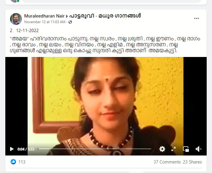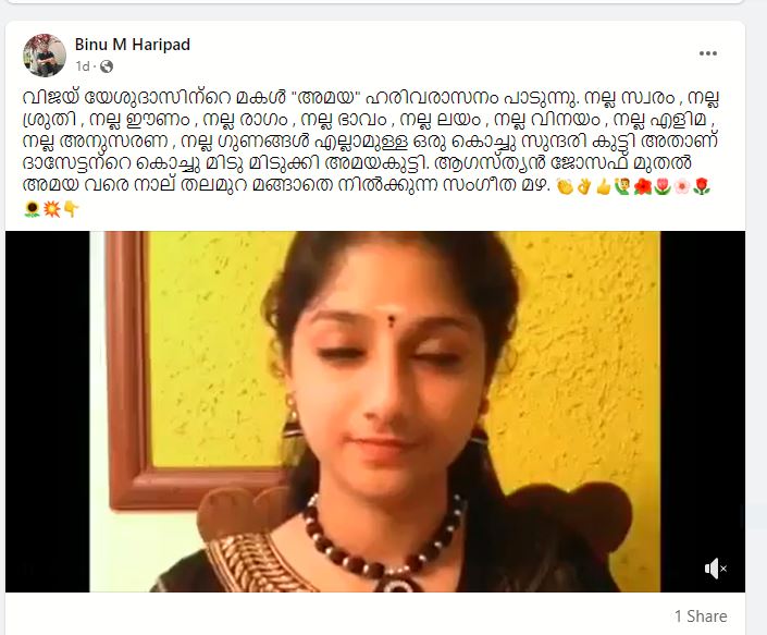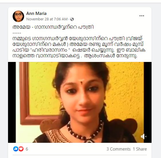 ”വിജയ് യേശുദാസിന്റെ മകൾ അമയ ഹരിവരാസനം എന്ന പാട്ട് പാടുന്നു.” എന്ന പേരിൽ ഒരു വീഡിയോ വൈറലാവുന്നുണ്ട്. “നല്ല സ്വരം, നല്ല ശ്രുതി, നല്ല ഈണം, നല്ല രാഗം, നല്ല ഭാവം, നല്ല ലയം, നല്ല വിനയം, നല്ല എളിമ, നല്ല അനുസരണ,നല്ല ഗുണങ്ങൾ എല്ലാമുള്ള ഒരുകൊച്ചുസുന്ദരിക്കുട്ടി അതാണ് ദാസേട്ടന്റെ കൊച്ചു മിടുമിടുക്കി അമയ. അഗസ്തൃൻ ജോസഫ് മുതൽ അമയ വരെ നാല് തലമുറ വരെ മങ്ങാതെ നിൽക്കുന്ന സംഗീത മഴ,”എന്നാണ് പോസ്റ്റിന്റെ വിവരണം.