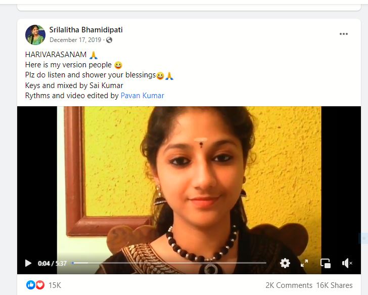 ഡിസംബർ 17,2019 ൽ അവരുടെ ഫേസ്ബുക്ക് പ്രൊഫൈലിൽ പങ്ക് വെച്ചതാണ് ഹരിവരാസനം എന്ന പാട്ട് പാടുന്ന ഈ വീഡിയോ.