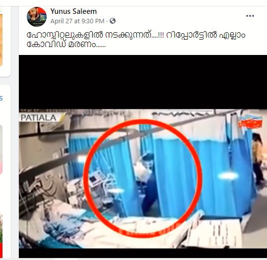 ബാംഗ്ളൂരിലെ ഒരു ആശുപത്രിയിൽ കോവിഡ് ബാധിച്ച രോഗികളെ തല്ലി കൊല്ലുന്നു എന്ന പേരിൽ ഒരു വീഡിയോ ഫേസ്ബുക്കിൽ പ്രചരിക്കുന്നുണ്ട്.അടിയന്തരചികിത്സ ആവശ്യമുള്ള കോവിഡ് രോഗികൾക്ക് പോലും ചികിത്സയ്ക്ക് ആവശ്യമായ ഓക്സിജനും മറ്റും കിട്ടാതെ ഭയാശങ്കകളോടെ കഴിയുന്ന കാലത്താണ് ബാംഗ്ലൂരിലെ ഓക്സ്ഫോഡ് യൂണിവേഴ്സിറ്റി ആശുപത്രിയിൽ കോവിഡ് രോഗികളെ കൊലപ്പെടുത്തുന്ന ദൃശ്യമാണ് എന്ന് പറഞ്ഞു ഈ ദൃശ്യം പ്രചരിക്കുന്നത് . ഹോസ്പിറ്റൽ കിടക്കയിലുള്ള രോഗികൾ ആക്രമിക്കപ്പെടുന്ന രണ്ട് വ്യത്യസ്ത ദൃശ്യങ്ങളാണ് പ്രചരിപ്പിക്കപ്പെടുന്നത്.കോവിഡ് മാനദണ്ഡങ്ങൾ സർക്കാർ കടുപ്പിക്കുകയും ജനങ്ങൾ ആകെ ഭീതിയിൽ കഴിയുകയും ചെയ്യുന്ന ഒരു സാഹചര്യത്തിലാണ് ഈ ദൃശ്യങ്ങൾ പുറത്തു വന്നിരിക്കുന്നത്.വിവാഹ ചടങ്ങുകളിൽ പങ്കെടുക്കാവുന്ന ആളുകളുടെ എണ്ണം 75 ൽ നിന്ന് 50 ലേക്ക് ചുരുക്കി. വിവാഹം, ഗൃഹപ്രവേശം തുടങ്ങിയ സ്വകാര്യ ചടങ്ങുകൾ കോവിഡ് ജാഗ്രതാ പോർട്ടലിൽ രജിസ്റ്റർ ചെയ്യണം. മരണാനന്തര ചടങ്ങുകളിൽ 20 പേർക്ക് മാത്രം പങ്കെടുക്കാം.ആരാധനാലയങ്ങളിലെ ഒത്തുചേരല് രണ്ട് മീറ്ററിൽ സാമൂഹിക ദൂരത്തില്, പരമാവധി 50 പേർക്കായിപരിമിതപ്പെടുത്തി. റമസാൻ ചടങ്ങുകളിൽ പള്ളികളിൽ പരമാവധി 50 പേർ മാത്രമേ പങ്കെടുക്കാവൂ. ചെറിയ പളളികളാണെങ്കിൽ എണ്ണം ഇതിലും ചുരുക്കണം. നമസ്കരിക്കാൻ പോകുന്നവർ പായ സ്വന്തമായി കൊണ്ടു പോകണം. ദേഹശുദ്ധി വരുത്താൻ ടാങ്കിലെ വെള്ളം ഉപയോഗിക്കരുത്. പകരം പൈപ്പ് വെള്ളം ഉപയോഗിക്കണം. ആരാധനാലയങ്ങളിൽ ഭക്ഷണവും തീർത്ഥവും നൽകുന്നത് ഒഴിവാക്കണം.