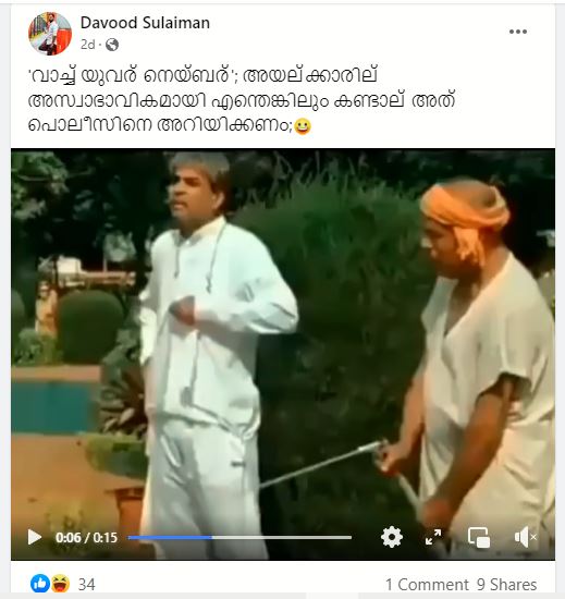 “വാച്ച് യുവർ നെയ്ബർ എന്ന പേരിൽ കേരള പോലീസിന് നിലവിൽ പദ്ധതികൾ ഒന്നുമില്ല. കൊച്ചി സിറ്റി പോലീസ് നടപ്പാക്കുന്നത് ‘സേ ഹലോ റ്റു യുവർ നെയ്ബർ ‘ എന്ന പദ്ധതിയാണ്,”ആ പോസ്റ്റ് പറയുന്നു