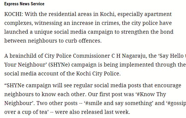 ”കൊച്ചിയിലെ പാർപ്പിട മേഖലകളിൽ, പ്രത്യേകിച്ച് അപ്പാർട്ട്മെന്റ് സമുച്ചയങ്ങളിൽ, കുറ്റകൃത്യങ്ങൾ വർധിക്കുന്ന സാഹചര്യത്തിൽ, കുറ്റകൃത്യങ്ങൾ തടയുന്നതിനായി അയൽക്കാർ തമ്മിലുള്ള ബന്ധം ശക്തിപ്പെടുത്തുന്നതിനായി സിറ്റി പോലീസ് ഒരു സോഷ്യൽ മീഡിയ കാമ്പെയ്ൻ ആരംഭിച്ചു.