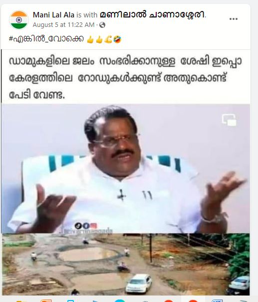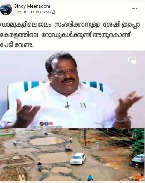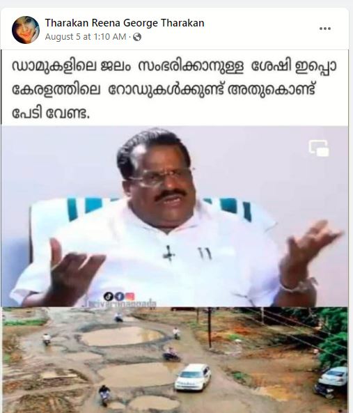`ഡാമുകളിലെ വെള്ളം സംഭരിക്കാനുള്ള ശേഷി കേരളത്തിലെ റോഡുകൾക്ക് ഉണ്ട്. അത് കൊണ്ട് പേടി വേണ്ട,’ എന്ന ഒരു വിവരണത്തോടൊപ്പം ആക്ഷേപ ഹാസ്യമായാണ് ചിത്രം ഫേസ്ബുക്കിൽ പ്രചരിക്കുന്നത്. ഇ പി ജയരാജൻ അങ്ങനെ ഒരു പ്രസ്താവന നടത്തിയിട്ടില്ലെങ്കിലും ഇത് ഒരു ട്രോളായിട്ടാണ് വായിക്കുന്നവർ കാണുന്നത് എന്ന് പോസ്റ്റുകളിലെ മറുപടികൾ സൂചിപ്പിക്കുന്നു. Tharakan Reena George Tharakan എന്ന ഐഡിയിൽ നിന്നുമുള്ള ഈ പോസ്റ്റ് ഞങ്ങൾ കാണുമ്പോൾ അതിന് 1 k ഷെയറുകൾ ഉണ്ടായിരുന്നു.