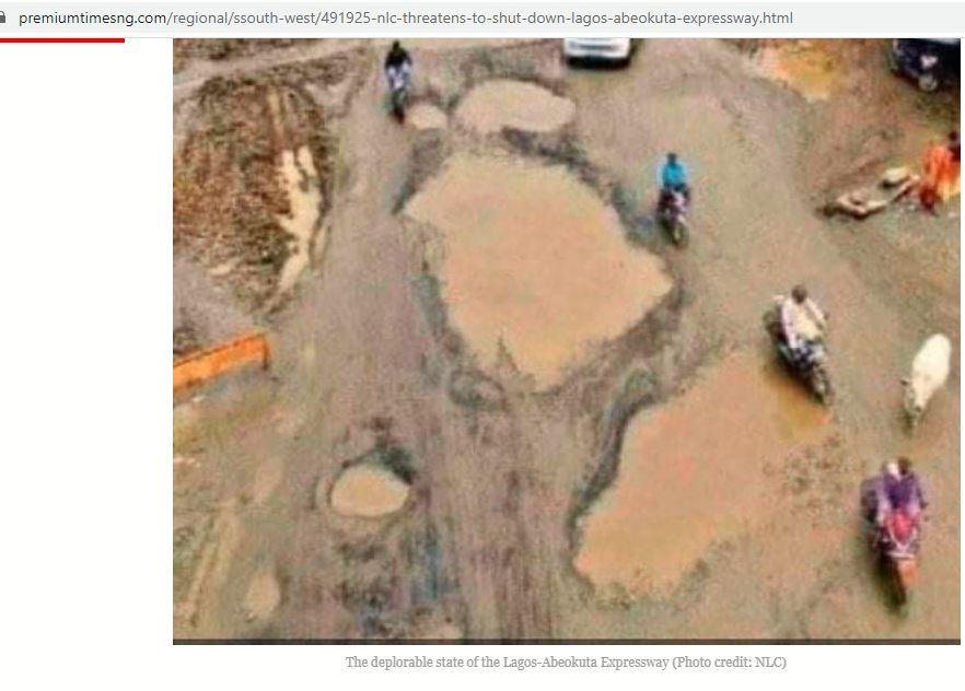 ബാറ്റ ടി വി എന്ന വെബ്സൈറ്റും ,നൈജീരിയ ലേബർ കോൺഗ്രസിന്റെ (എൻഎൽസി) ലാഗോസ്, ഒഗൂൺ ചാപ്റ്ററുകൾ ബുധനാഴ്ച ലാഗോസ്-അബിയോകുട്ട എക്സ്പ്രസ് വേയിലെ സാംഗോ ഒട്ട സെക്ഷന്റെ ശോചനീയാവസ്ഥയ്ക്കെതിരെ പ്രതിഷേധിക്കാൻ ഒരുങ്ങുന്നുവെന്ന വിവരണത്തോടെ ഒക്ടോബർ 26 2021 ന് ഈ വാർത്ത കൊടുത്തിട്ടുണ്ട്.
