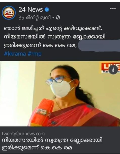 ആർ എം പി നിയമസഭയിൽ പ്രത്യേക ബ്ലോക്കായി ഇരിക്കാൻ ആവശ്യപ്പെട്ടതായുള്ള വാർത്തയ്ക്കൊപ്പം,ഞാൻ ജയിച്ചത് എന്റെ കഴിവ് കൊണ്ട് എന്ന് ആർ എം പി നേതാവ് കെ കെ രമ പറയുന്നതായി ഒരു പോസ്റ്റ് ഫേസ്ബുക്കിൽ പ്രചരിക്കുന്നുണ്ട്. നിറയെ ചുവന്ന പൂക്കൾ എന്ന ഐ ഡി യിൽ നിന്നും മേയ് 24നു പോസ്റ്റ് ചെയ്ത ഈ അവകാശവാദത്തിന് ഇത് വരെ 3.8 k വ്യൂവുകളുണ്ട്. മലർവാക എന്ന ഐഡിയിൽ നിന്നും അതെ ദിവസം പോസ്റ്റ് ചെയ്ത സമാനമായ പോസ്റ്റിന് 2 .6 k വ്യൂവുകളുണ്ട്.