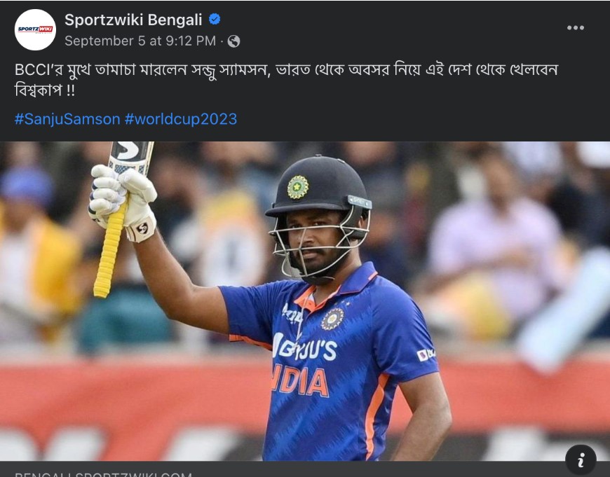 ഇന്ത്യൻ ടീമിൽ നിന്ന് പുറത്തായതിന് പിന്നാലെ സഞ്ജു സാംസണെ അയർലൻഡ് ടീമിൽ ഉൾപ്പെടുത്തി. ഏഷ്യാ കപ്പ്ഏഷ്യാ കപ്പിനുള്ള ടീമിൽ നിന്ന് സഞ്ജുവിനെ ഒഴിവാക്കിയതിനെ തുടർന്നാണ് ഈ അവകാശവാദം. ഫേസ്ബുക്കിൽ Sportzwiki Bengali എന്ന ബംഗാളി ഭാഷയിലെ പ്രമുഖ സ്പോർട്സ് പ്ലാറ്ഫോമാണ് ഈ അവകാശവാദം ഉന്നയിച്ചത്.