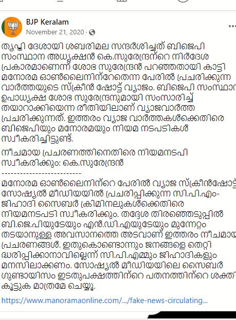 “മനോരമ ഓൺലൈനിന്റെ പേരിൽ വ്യാജ സ്ക്രീൻഷോട്ട് സോഷ്യൽ മീഡിയയിൽ പ്രചരിപ്പിക്കുന്ന സി.പി.എം-ജിഹാദി സൈബർ ക്രിമിനലുകൾക്കെതിരെ നിയമനടപടി സ്വീകരിക്കും. തദ്ദേശ തിരഞ്ഞെടുപ്പിൽ ബി.ജെ.പിയുടേയും എൻ.ഡി.എയുടേയും മുന്നേറ്റം തടയാനുള്ള അവസാനത്തെ അടവാണ് ഇത്തരം നീചമായ പ്രചരണങ്ങൾ. ഇതുകൊണ്ടൊന്നും ജനങ്ങളെ തെറ്റിദ്ധരിപ്പിക്കാനാവില്ലെന്ന് സി.പി.എമ്മും ജിഹാദികളും മനസിലാക്കണം. സോഷ്യൽ മീഡിയയിലെ സൈബർ ഗുണ്ടായിസം ഇടതുപക്ഷത്തിന്റെ പതനത്തിന്റെ ശക്തി കൂട്ടുക മാത്രമേ ചെയ്യൂ,” എന്നാണ് ബിജെപി കേരളത്തിന്റെ കുറിപ്പ് പറയുന്നത്.