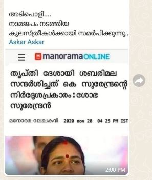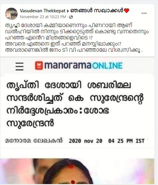 തൃപ്തി ദേശായി ശബരിമല സന്ദർശിച്ചത് ബിജെപി സംസ്ഥാന അധ്യക്ഷൻ കെ.സുരേന്ദ്രന്റെ നിർദേശ പ്രകാരമാണെന്ന് ശോഭ സുരേന്ദ്രൻ പറഞ്ഞതായി കാട്ടി മനോരമ ഓൺലൈനിന്റേതെന്ന പേരിൽ വാർത്തയുടെ സ്ക്രീൻ ഷോട്ട് വാട്ട്സ്ആപ്പിൽ പ്രചരിക്കുന്നുണ്ട്. നവംബർ 20,2020ലെ വാർത്തയുടെ സ്ക്രീൻ ഷോട്ടാണ് പ്രചരിക്കുന്നത്.