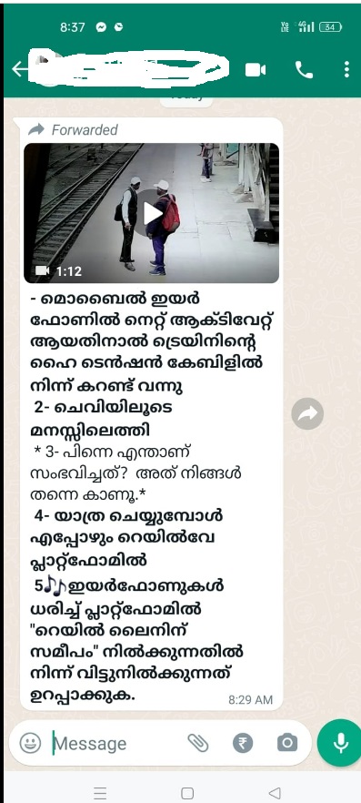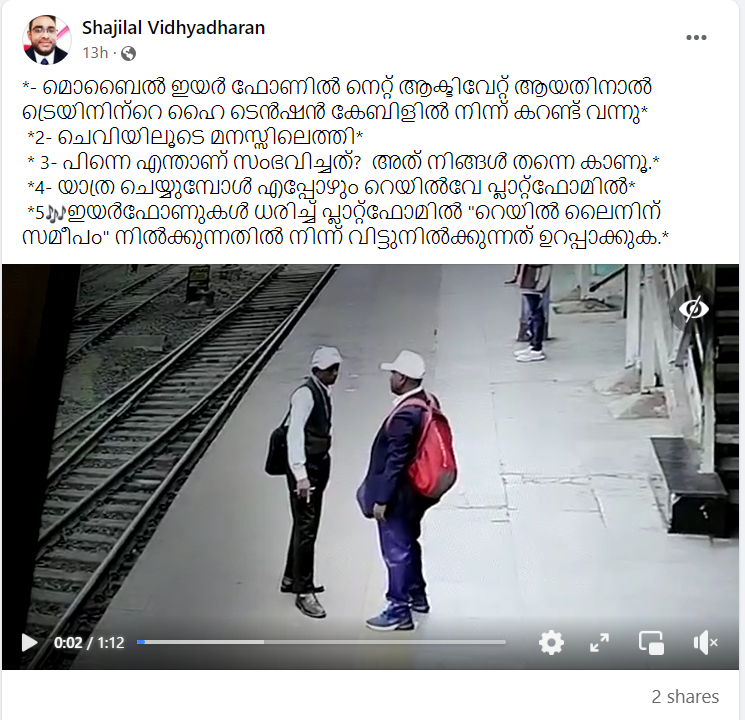“മൊബൈൽ ഇയർ ഫോണിൽ നെറ്റ് ആക്ടിവേറ്റ് ആയതിനാൽ ട്രെയിനിന്റെ ഹൈ ടെൻഷൻ കേബിളിൽ നിന്ന് കറണ്ട് വന്നു. ചെവിയിലൂടെ മനസ്സിലെത്തി. പിന്നെ എന്താണ് സംഭവിച്ചത്? അത് നിങ്ങൾ തന്നെ കാണൂ. ഇയർഫോണുകൾ ധരിച്ച് പ്ലാറ്റ്ഫോമിൽ “റെയിൽ ലൈനിന് സമീപം” നിൽക്കുന്നതിൽ നിന്ന് വിട്ടുനിൽക്കുന്നത് ഉറപ്പാക്കുക,” എന്നാണ് പോസ്റ്റിനൊപ്പമുള്ള വിവരണം. മൊബൈൽ ഫോൺ ഉപഭോക്തകൾക്ക് ഒരു ഉപദേശം എന്ന പോലെയാണ് പോസ്റ്റുകൾ ഷെയർ ചെയ്യുന്നത്. വാട്ട്സ്ആപ്പിലാണ് പോസ്റ്റ് പ്രധാനമായും ഷെയർ ചെയ്യപ്പെടുന്നത്.